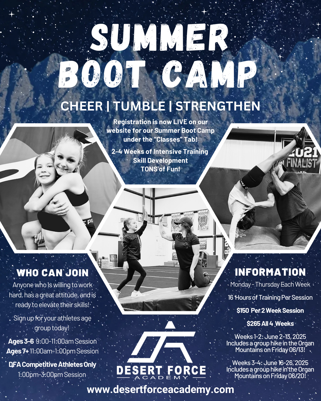 Bienvenidos! Join us at Desert Force Academy in Las Cruces, NM for our 4th Annual Desertfest Stunt & Tumble Weekend—a celebration of soaring stunts, powerful tumbling, and the energy, passion, and love that make cheer so special. Join us as we bring the spirit back to the floor and make this year our most unforgettable yet!